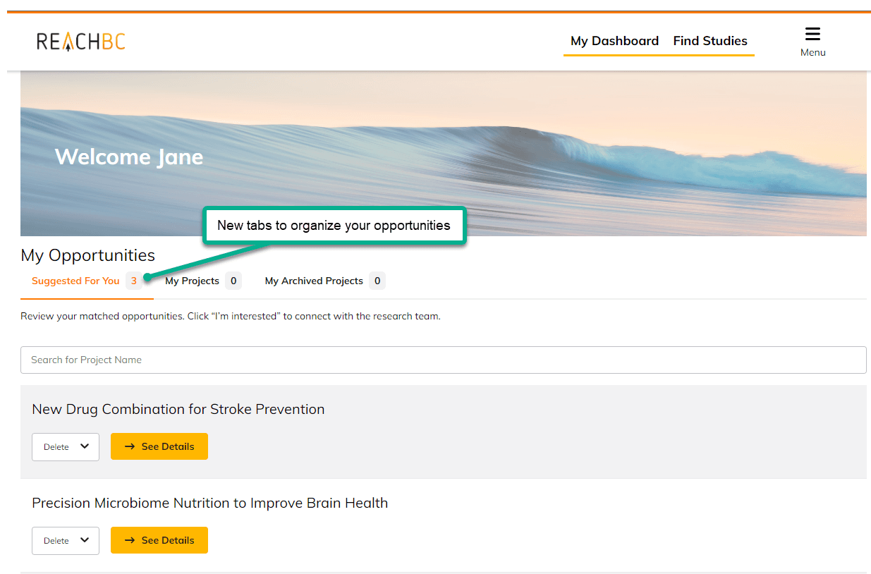 We’ve decluttered your dashboard. Your research opportunities are now organized across 3 tabs. Clearly see any new matched opportunities that need your attention under 'Suggested For You'.