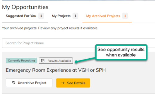 After viewing the details and clicking “I’m Interested”, the opportunity will move to the 'My Projects' tab as you wait to hear from the research team to see if you can participate in the research project. You can then archive and save any opportunities you want to reference in the future in the 'My Archived Projects' tab.
